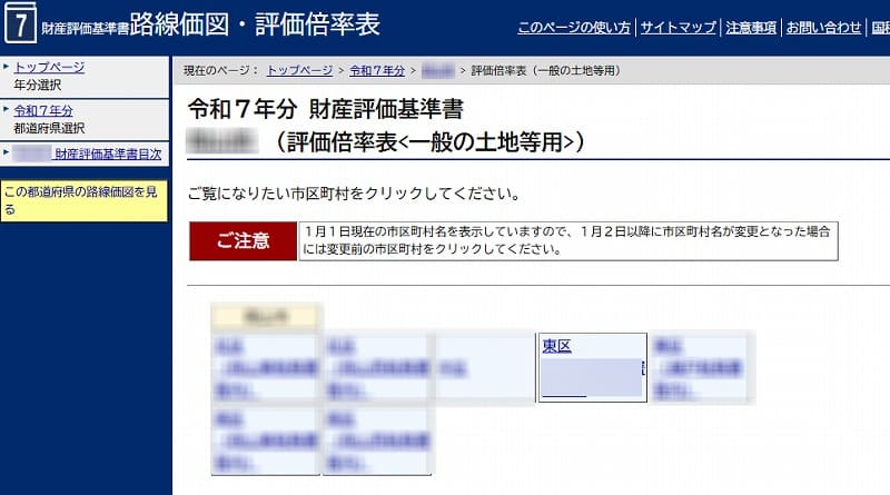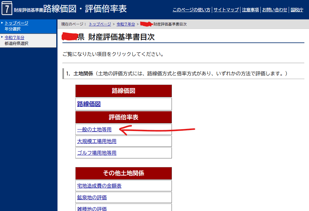 ↑うちの実家の場合は路線価方式なのか倍率方式なのかわからなかったので、「評価倍率表」の「一般の土地用」をクリックしました。