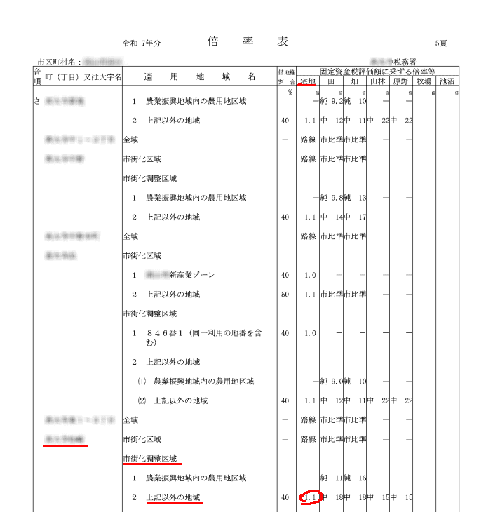 ↑実家の「町名」で「宅地」、実家は市街化調整区域だったのでその項目の「上記以外の地域」のところを参照します。「1.1」と書いてあります。